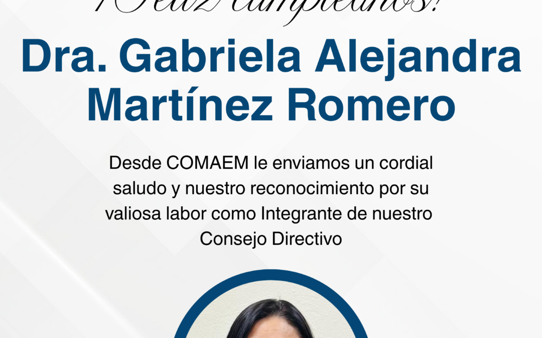 El Consejo Mexicano para la Acreditación de la Educación Médica (COMAEM) felicita a la Dra. Gabriela Alejandra Martínez Romero, integrante de su Consejo Directivo, con motivo de su cumpleaños.