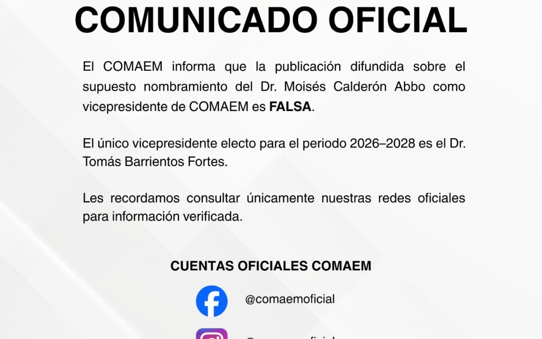 El Consejo Mexicano para la Acreditación de la Educación Médica (COMAEM) informa que la publicación realizada por Hospital Ángeles Lomas en la que se felicita al Dr. Moisés Calderón Abbo por un supuesto nombramiento como vicepresidente de COMAEM 2026–2027 y presidente 2028–2029, es completamente falsa.