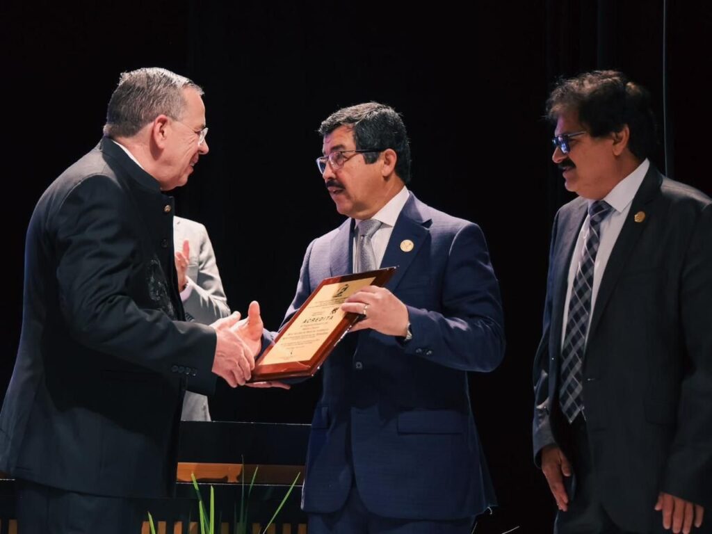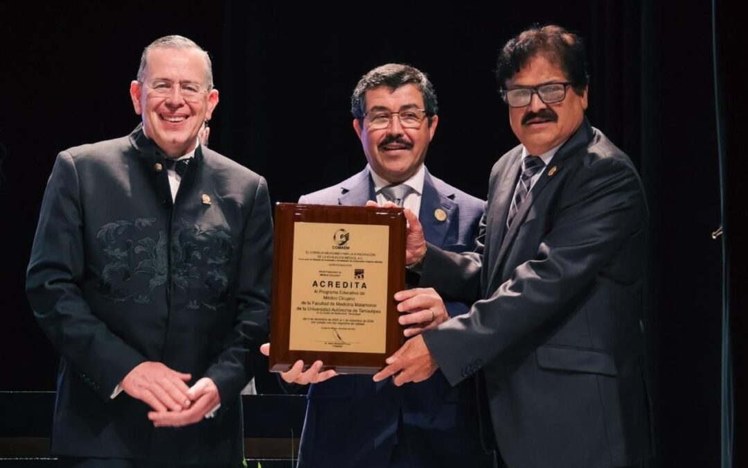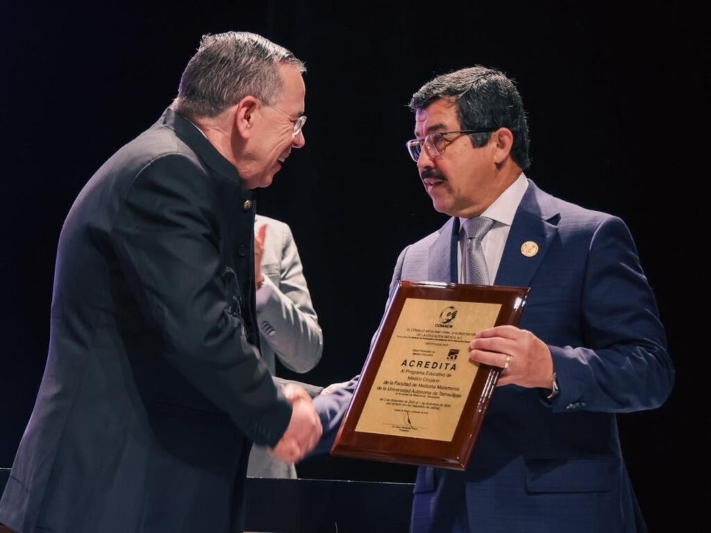 En este marco, el MVZ MC Dámaso Anaya Alvarado, Rector de la UAT, recibió de manos del Dr. Julio César Gómez Fernández, Presidente del COMAEM, la placa de acreditación del programa de Médico Cirujano que se imparte en la Facultad de Medicina Matamoros.