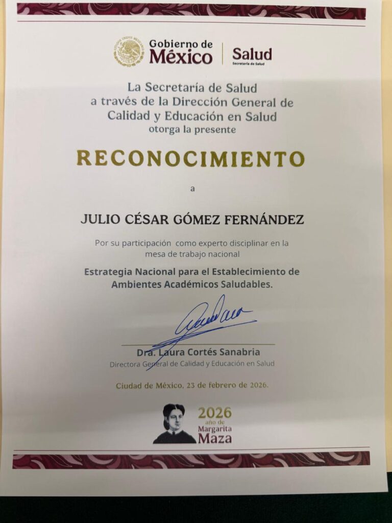 Ambos recibieron un reconocimiento por su valiosa contribución en el fortalecimiento de políticas orientadas a consolidar entornos formativos más seguros, éticos y de calidad para las y los profesionales de la salud en México.
